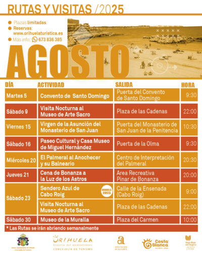 All activities are free and have limited capacity, so advance registration is essential. Reservations can be made weekly through the official website www.orihuelaturistica.es or by sending a WhatsApp message to 673 836 385.