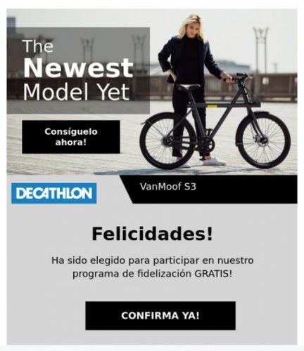 The ‘bicycle scam’ sees thieves imitating the web page of sports equipment company ‘Decathlon’. The scammers create a very convincing looking email, complete with logos and images, made to match Decathlon’s real style and branding. In the email they claim that you have won a great Van Moof S3 electric bicycle, valued at more than 2,500 euros.